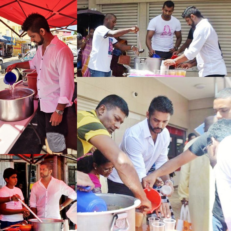Diksh Potter distributes juice to Cavadee pilgrims at Riviere des Anguilles